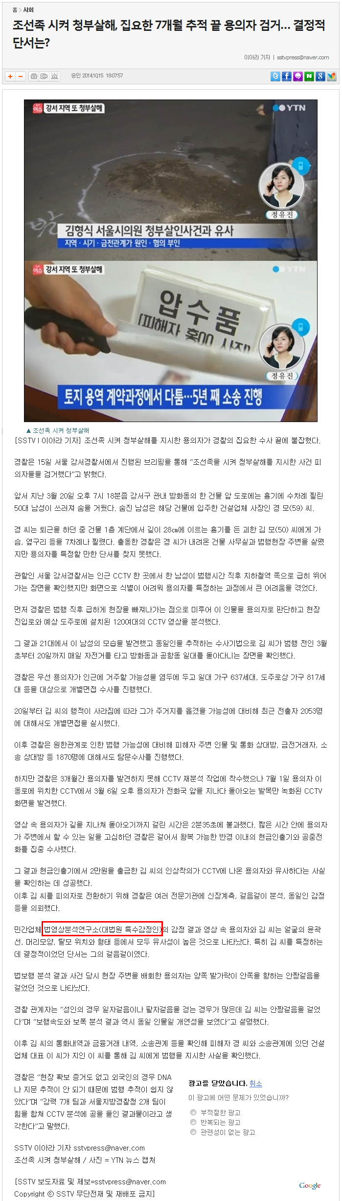 ¹ý¿µ»óºÐ¼®¿¬±¸¼Ò¿¡¼ °¼°æÂû¼¿¡¼ ÃßÀûÁßÀÌ´ø ûºÎ »ìÇØ ¿ëÀÇÀÚ °Ë°Å¿¡ µ¿ÀÏÀÎ ½Äº°¿¡ ´ëÇÑ ºÐ¼®À» ÁøÇàÇÏ¿´½À´Ï´Ù. ±× °á°ú ûºÎ »ìÇØÀÚ¿¡ ´ëÇÑ ½ÅüÀÇ Æ¯¼º°ú Çൿ ÆÐÅÏÀ» ºÐ¼®ÇÏ¿© ¿ëÀÇÀÚ¸¦ °Ë°ÅÇÏ°Ô µÇ¾ú½À´Ï´Ù. ³¯·Î Áõ°¡ÇÏ´Â ¹üÁË¿¡ ¿µ»óÀº °úÇмö»ç¿¡¼ »©³õÀ» ¼ö ¾ø´Â Áß¿äÇÑ ¸Åü·Î Ȱ¿ëµÇ°í ÀÖ½À´Ï´Ù. º» ¿¬±¸¼ÒÀÇ ÀÛÀº ÈûÀÌ ¾ï¿ïÇÑ ÇÇÇØÀÚ¸¦ µµ¿ï ¼ö ÀÖ´Â °è±â°¡ µÇ¾î ±âºÐÀÌ ÁÁ½À´Ï´Ù.